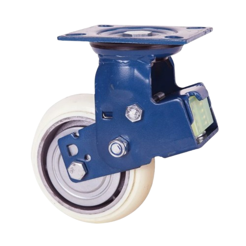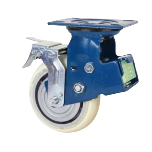 Salah satu tipe caster yang memiliki double spring di bagian belakang yang dapat meredam guncangan berlebihan pada pallet/trolley. Caster ini juga memiliki elastic PU di bagian belakangnya. Elastic PU ini melapisi double spring sehingga dapat lebih efektif meredam guncangan berlebihan. Material roda yang digunakan adalah white PU. Kelebihan white PU adalah tidak membekas di lantai/non marking. Caster ini cocok ketika diaplikasikan pada trolley/pallet yang ditarik menggunakan towing. Caster ini juga sering digunakan di industri otomotif atau industri yang memerlukan caster yang dapat meredam guncangan secara efektif.